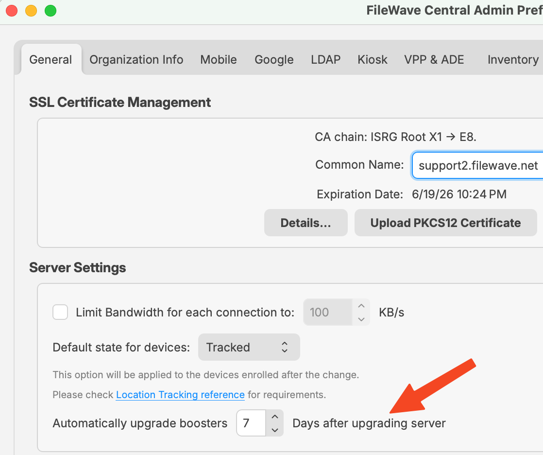 Automatic upgrades: By default, Boosters are automatically upgraded one week after the Server upgrade. The delay is configurable in FileWave Central -> Preferences, and administrators can unschedule the upgrade if desired.