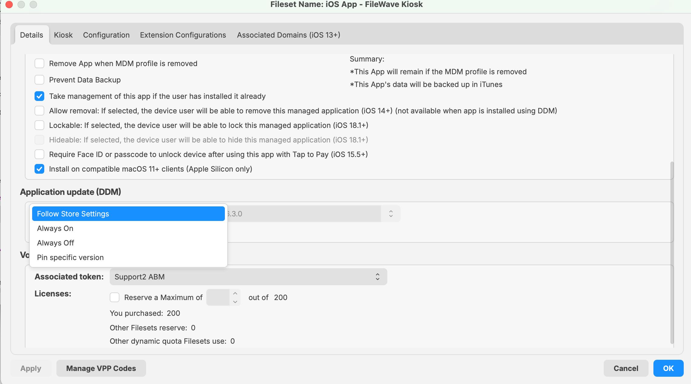 For supported apps installed through DDM in FileWave 16.3.x, this controls how the App is updated on iOS, iPadOS, and macOS. Choose Follow Store Settings, Always On, Always Off, or Pin specific version. If you choose Pin specific version, use the version field to target the exact App Store version to install and keep. |