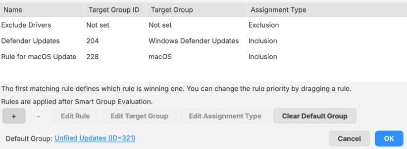 Rules may added or removed using the + and - buttons respectively, whilst the highlighted rule may have the target group or assignment type edited. Default Group may be cleared if set.