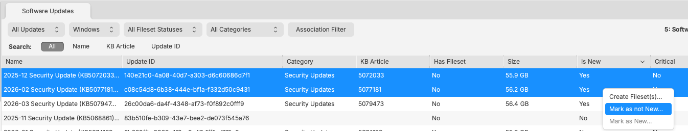 Manual Fileset creation from the Software Update view also sets the 'Is New' flag as 'No'. Updates left untouched will remain as new and come into scope after the defined period of time.