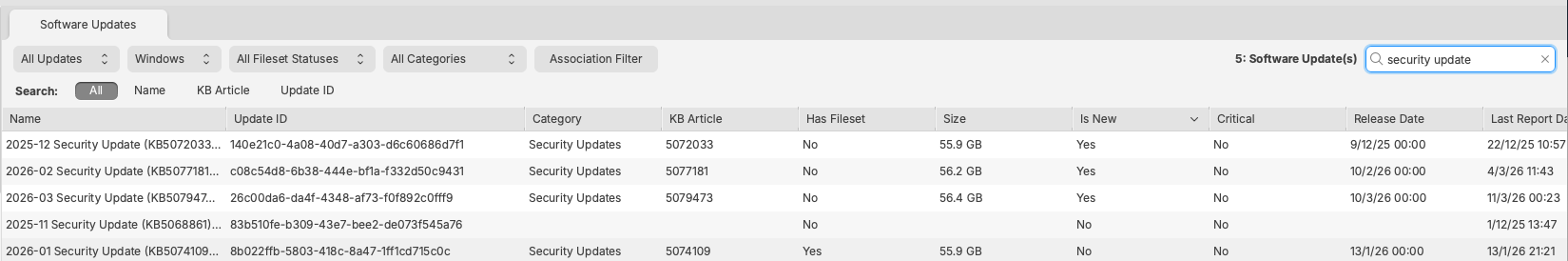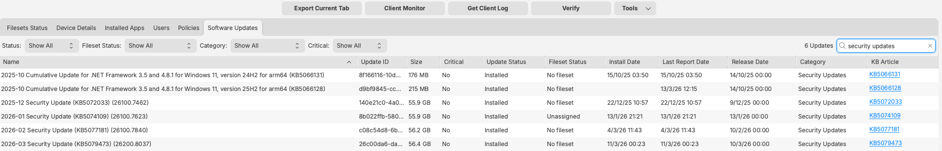 However, the Software Updates view in FileWave Central shows all updates, reported across all Apple or Microsoft devices, with further filter options. As devices report into FileWave, this view will continually update.