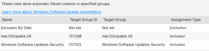 Automation Rules are used to target any chosen updates, set as new, and build out Filesets, aiming at only desired updates or ignore others, by way of inclusions or exclusions. For example, are all Windows driver packs desirable?