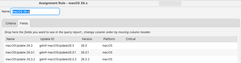 The macOSUpdate 26 rule is set to include all macOS 26 Updates. Likewise, the Windows Software Updates Security is set to include all updates that have the Category 'Security Updates'.
