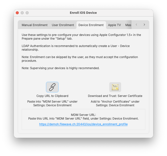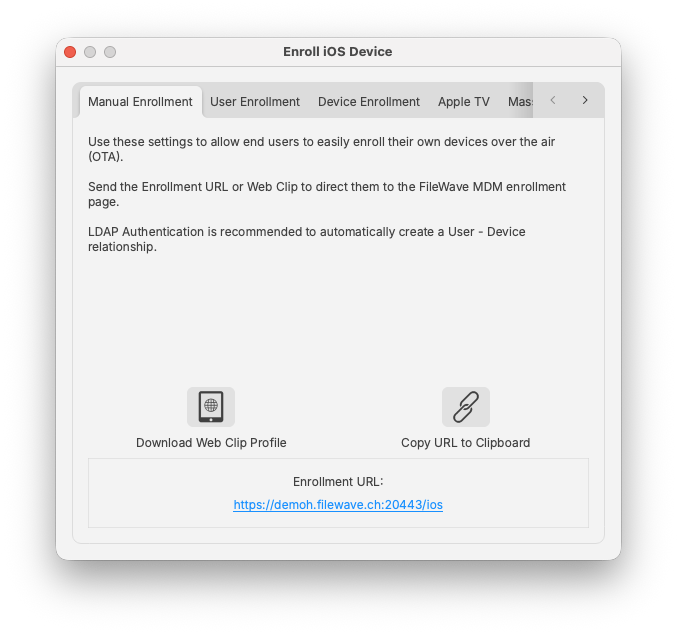 You can create a Web Clip with that URL embedded or copy the URL to the Clipboard and email it to your users. When they go to that URL on their mobile device, they will get instructions on how to properly enroll their device with your server. Having your FileWave server linked to your LDAP server allows the users to authenticate as themselves, instead of using a generic user account. This provides the benefit of having the user's LDAP record link its account information to the device. Another result of this is that the user can be automatically invited to link their Apple ID with your FileWave VPP service.