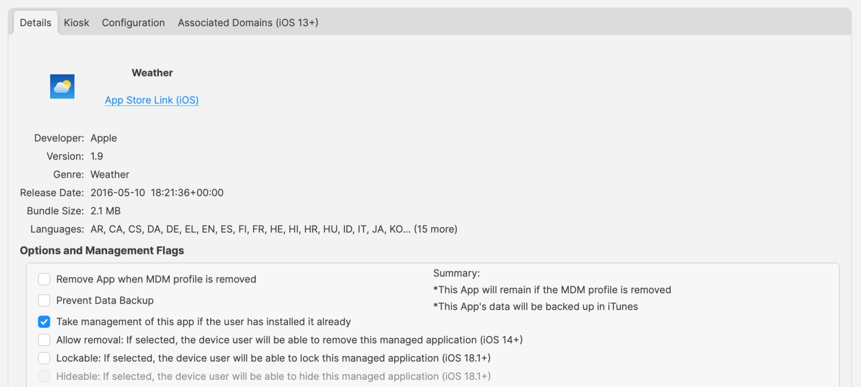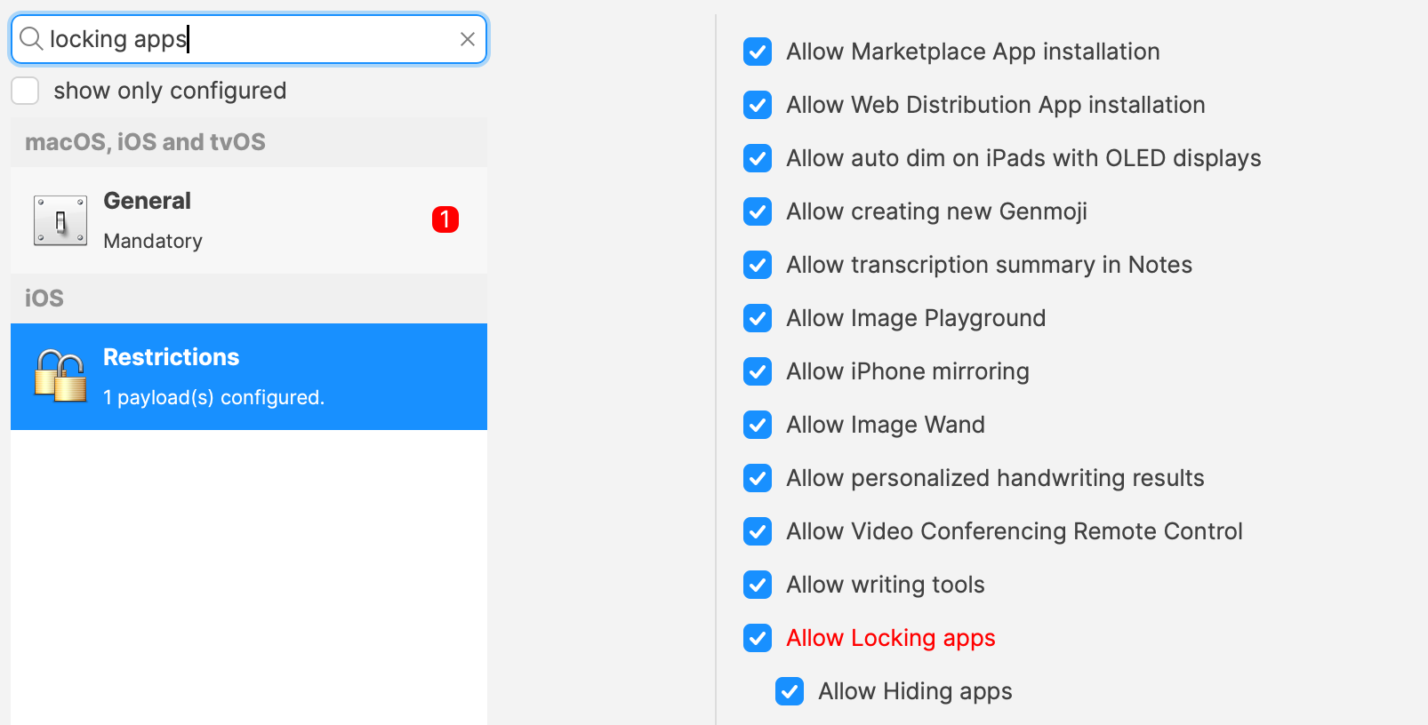 Each VPP App has two new options, one for Lock and one for Hide, allowing MDM to define Apps, on an individual basis, to be set as Locked or Locked and Hidden: