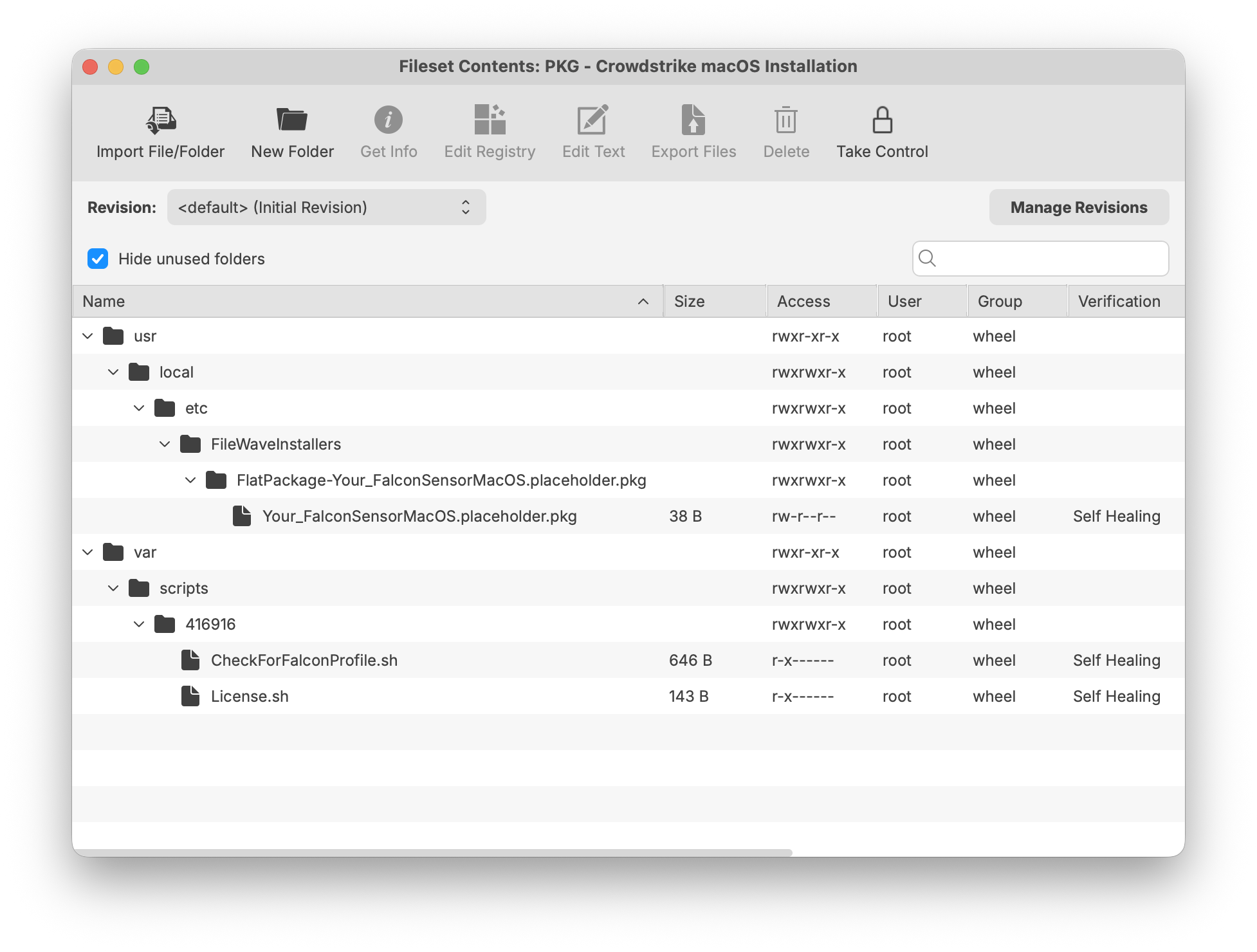 The PKG installer fileset includes three components. The template below can be used to upload your specific version of the CrowdStrike PKG installer. Ensure the installation folder and PKG file name are labeled correctly to support a successful deployment.