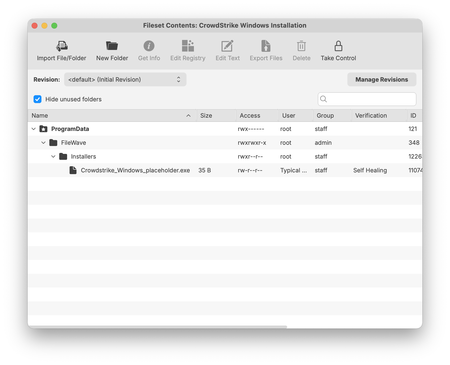 CrowdStrike deployment for Windows devices has one Fileset. This Fileset includes a placeholder for your EXE installer with template launch arguments.
