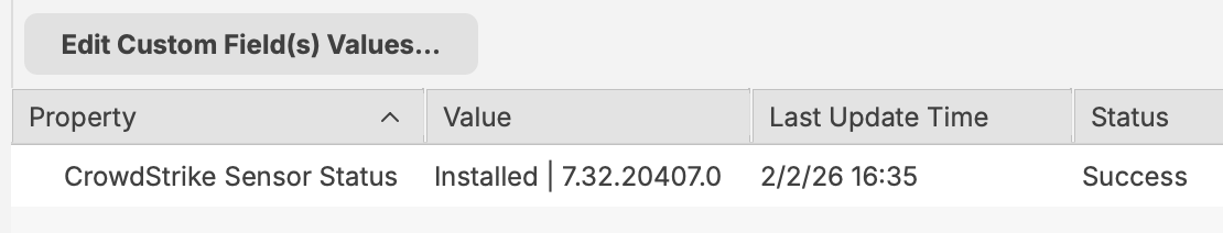 Monitoring the CrowdStrike Falcon Sensor through FileWave custom fields helps ensure endpoint protection remains active and compliant. By validating that the Falcon service is running and reporting the installed sensor version, administrators can quickly detect inactive or outdated agents that may leave devices exposed. This custom fields includes both macOS and Windows.