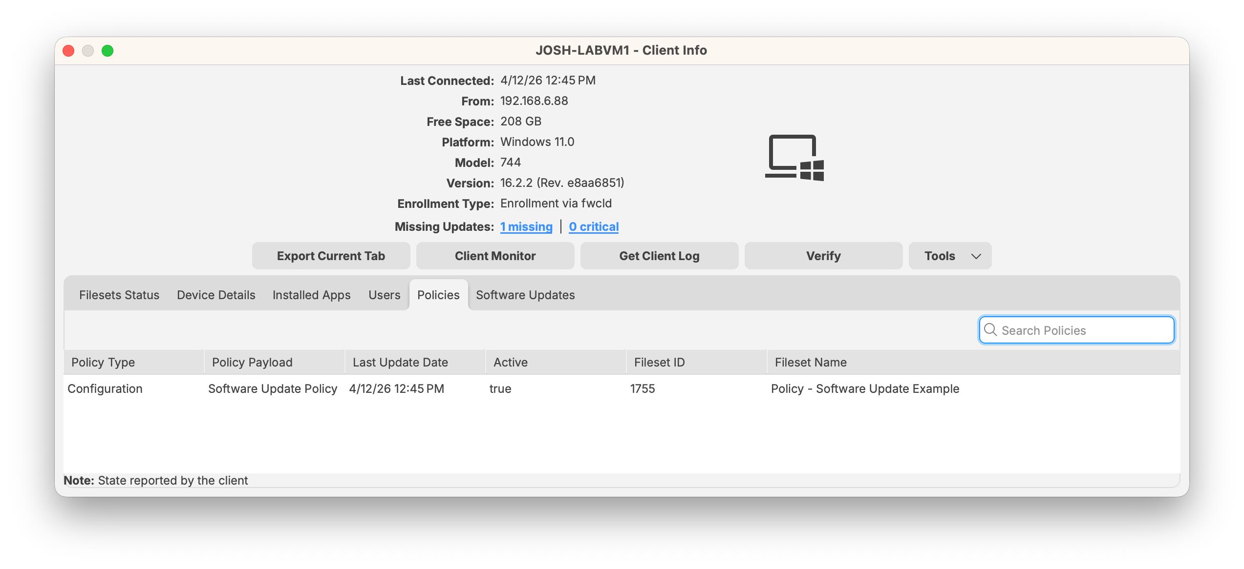 You can also confirm that the policy itself is active on the device in Client Info > Policies, as shown below.